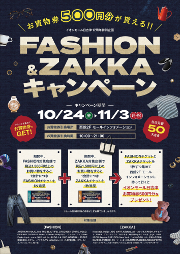 【10/24 (金)~11/3 (月・祝)期間限定】FASHION&ZAKKAキャンペーン開催!イオンモール日吉津お買い物券500円分プレゼント